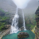 黄龙潭幽深、静谧,古木掩映的峡谷间,一道溪涧穿绕石垒而下,银色瀑布冲击成暗绿色的深潭。静坐潭边,听古道落叶、宿鸟鸣涧,自然升起远离尘世、超凡脱俗之感。