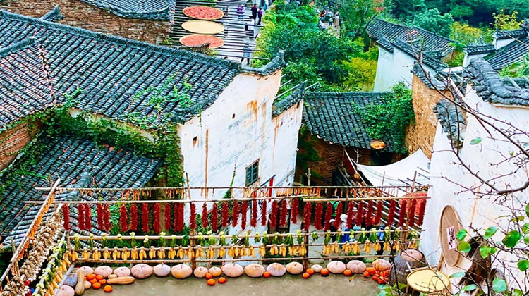 挂在山崖上的篁岭古村,地无三尺平,数百年来,村民早已习惯用平和的心态与崎岖的地形“交流”,绘就出了一处“晒秋人家”风情画。