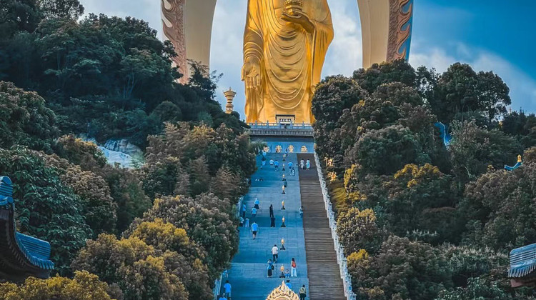 世界较高的阿弥陀佛铜像——48米高的东林大佛,这座金灿灿的大佛屹立在高山之巅,48米高的东林大佛整体造型吸收了龙门石窟等盛唐佛像优点,代表了当代较高水平的宗教艺术精品,中国少有的露天阿弥陀佛铜像。