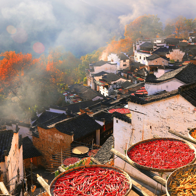 立秋一到,篁岭古村就成了一个天地晒场。来晒秋人家赏红枫,欣赏屋顶晒秋,枫林尽染,体验民风民俗,手摇风车、套南瓜等,感受晒秋人家的乡愁韵味。